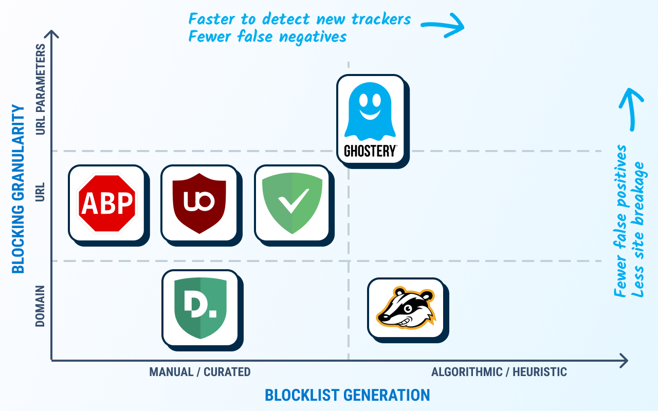 - Heuristics & algorithms: These tools use heuristic and/or algorithmic analysis to determine when to block or modify requests. Examples include Privacy Badger and Ghostery’s own anti-tracking system.