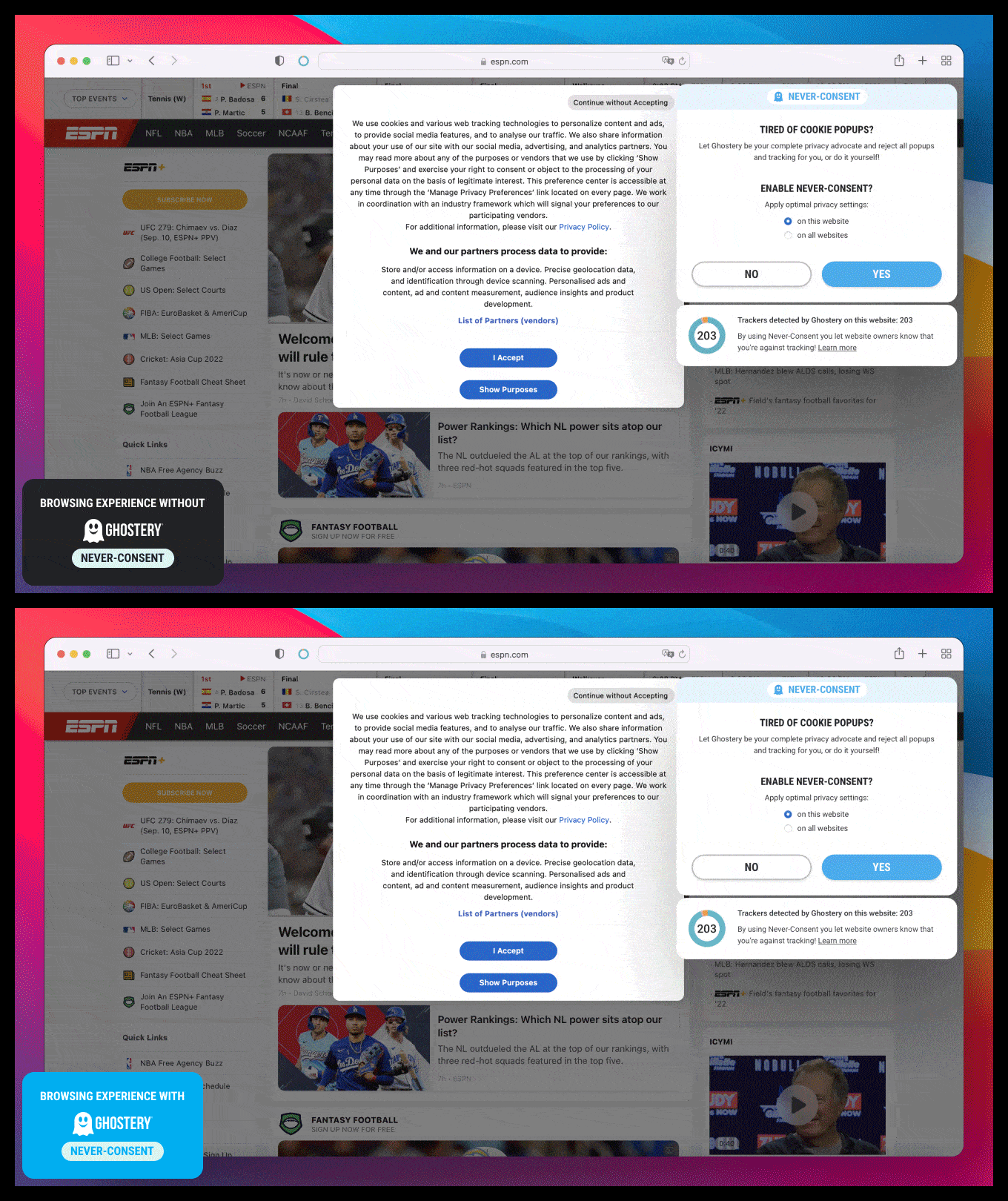 Ghostery for Safari, MacOS: Browsing experience with Never-Consent enabled vs. disabled