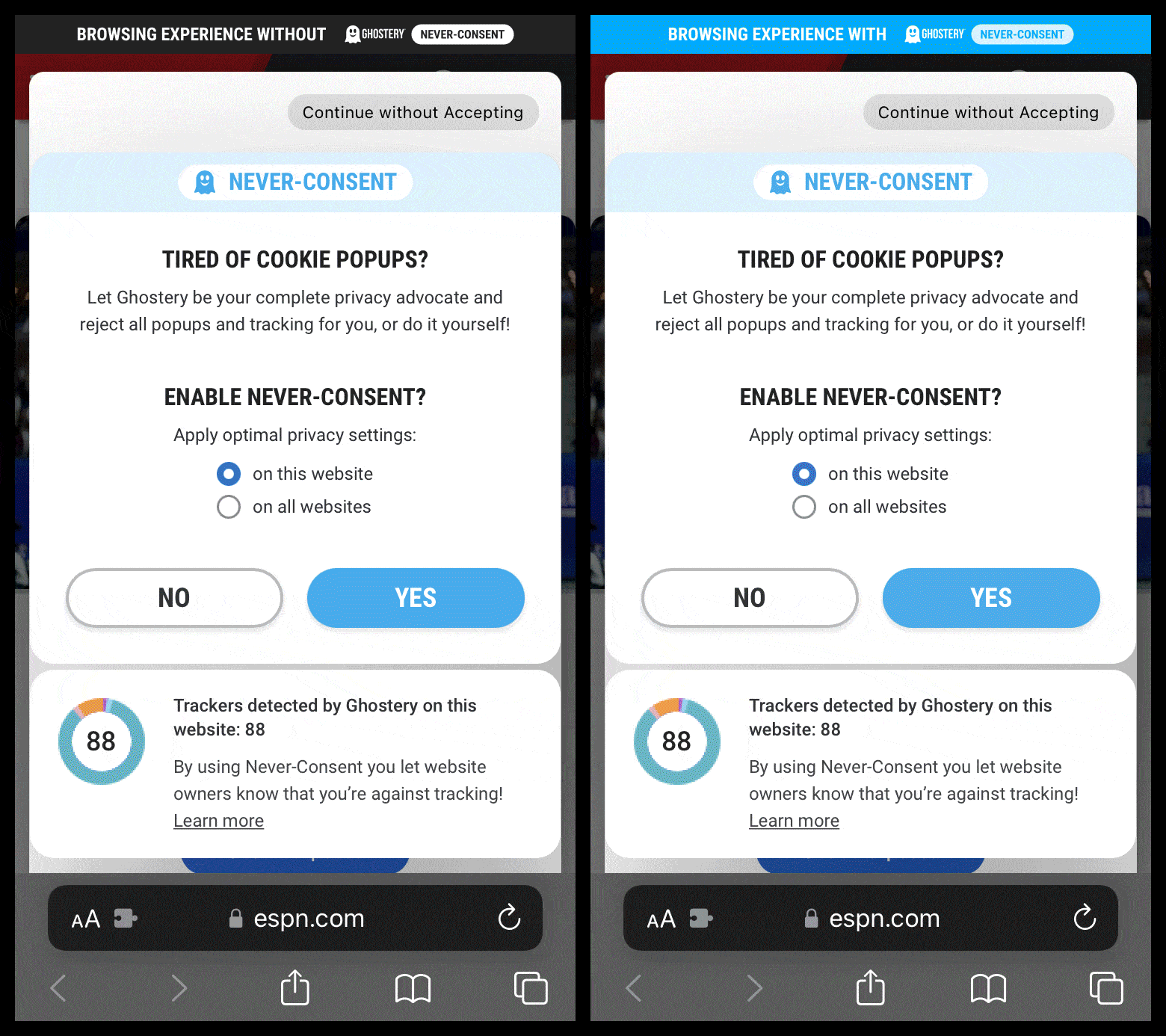 Ghostery for Safari, iOS: Side by side browsing experience with Never-Consent enabled vs. disabled